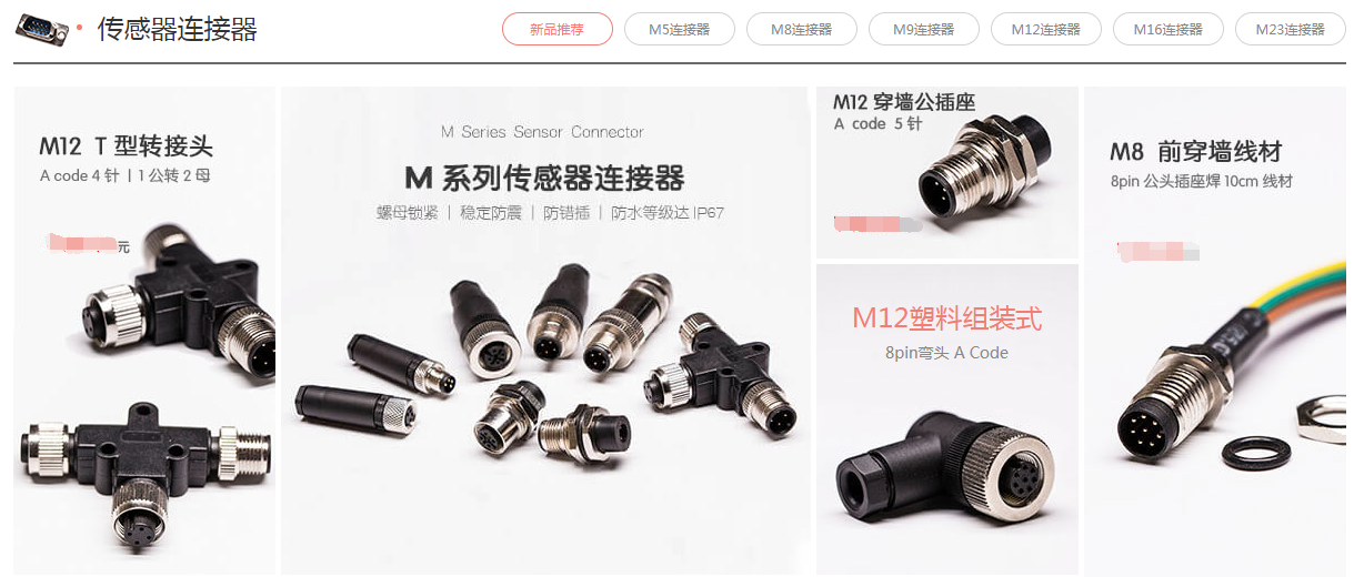 【产品芯数】 M12连接器公头为180度直型。针芯数为3针、4针、5针、6针、7针、8针。