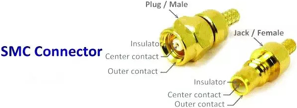 SMC的全称是SubMiniature version C,也是1960年代发明的射频同轴连接器。它采用#10-32 UNF螺纹接口,在直流到10GHz范围内可以提供优秀的电气性能。SMC公头有外部螺纹,SMC母头上有配套螺母。特性阻抗有2种:50欧姆与75欧姆,它为小型同轴线缆及对于尺寸非常在意的印刷电路板提供了互联方式。