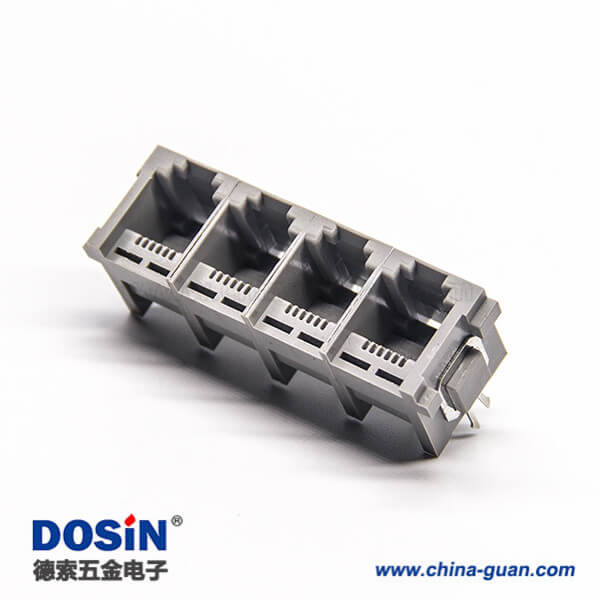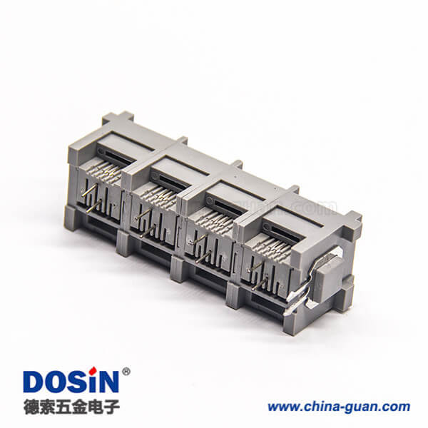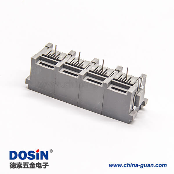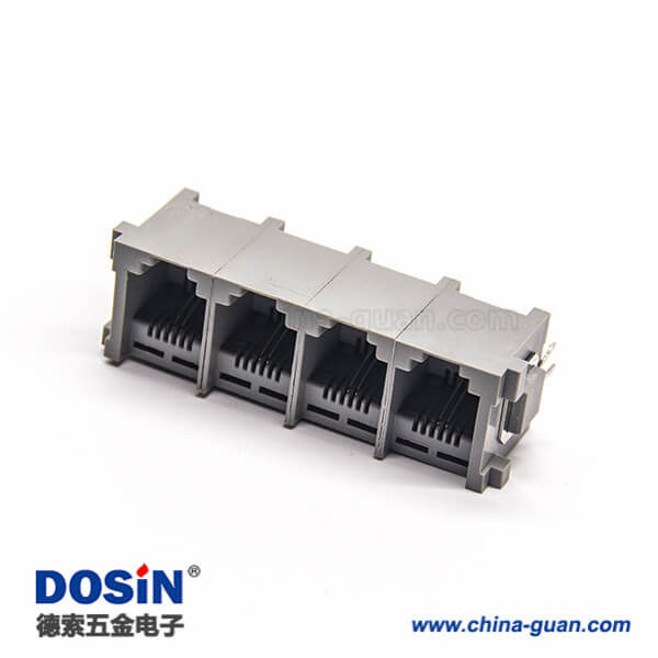 料号:DOSIN-819-0640 标签:RJ45插座,6P2C,4端口,1*4,弯式90°,触头镀金,插孔,PCB板安装,非屏蔽,不带灯,不带滤波
