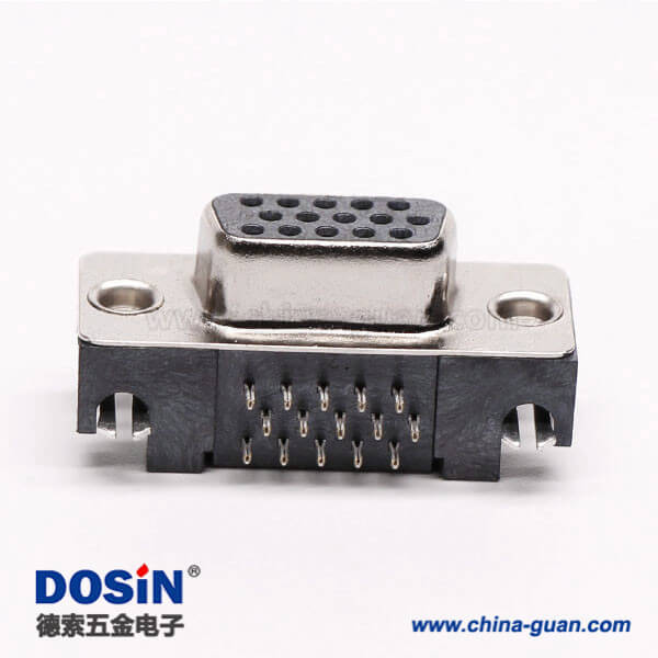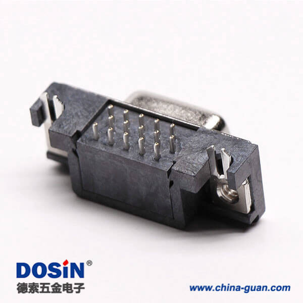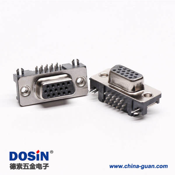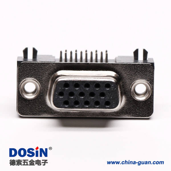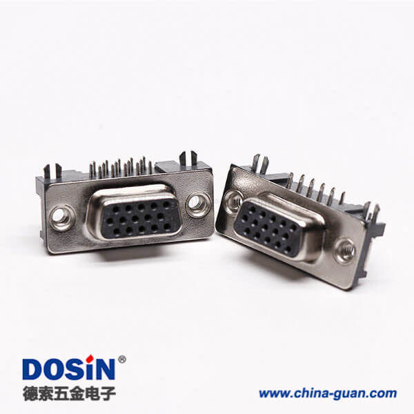 料号:DOSIN-868-0174 标签:D-sub连接器,高密度,直角弯头,母头,15针,铆锁不带螺丝,穿孔,插pcb板,黑色胶芯